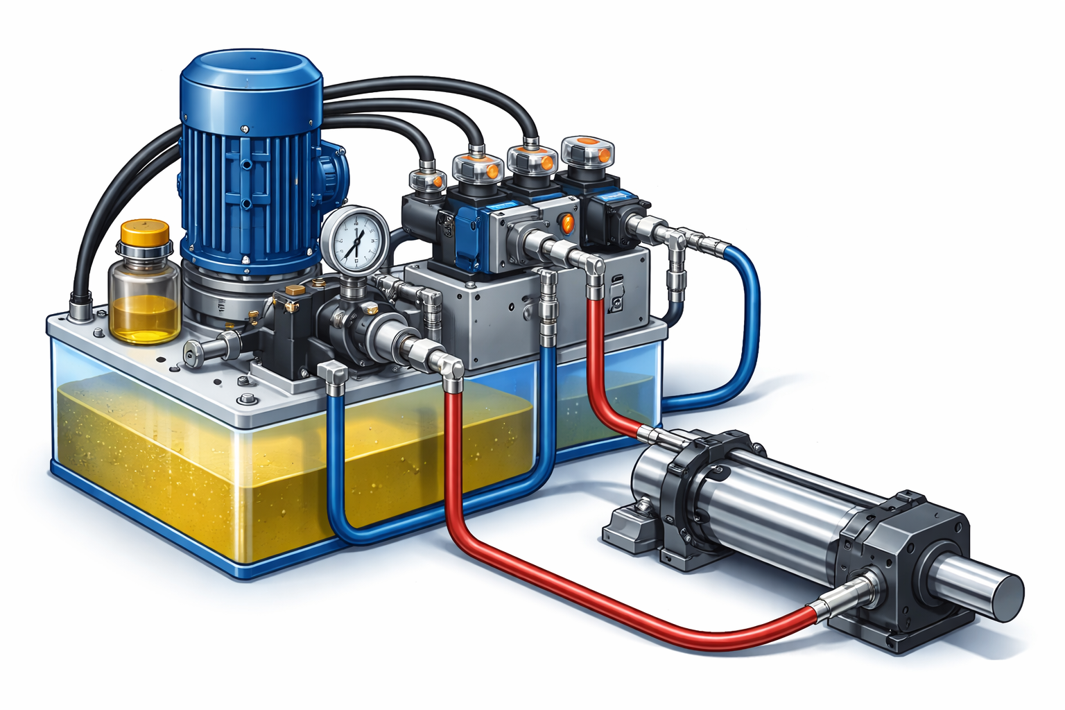 Aunque existen muchas configuraciones, la mayoría de los sistemas hidráulicos industriales cuentan con los siguientes elementos:
