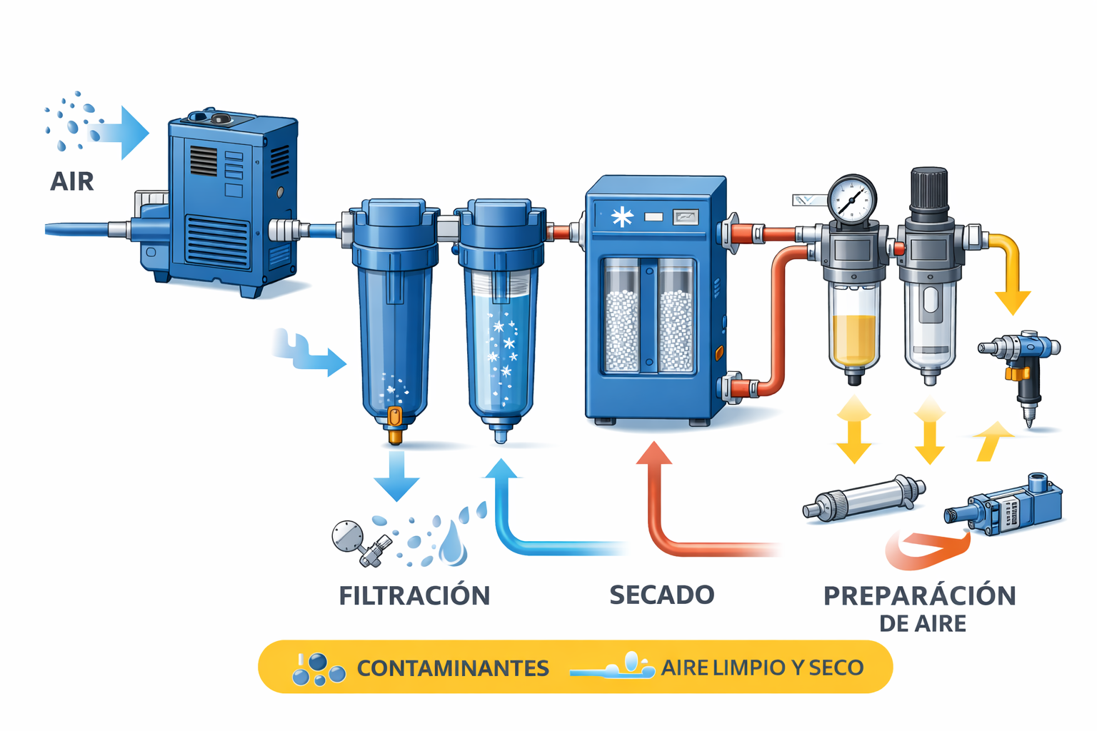 El aire comprimido pasa por diferentes etapas de acondicionamiento antes de llegar a los equipos.