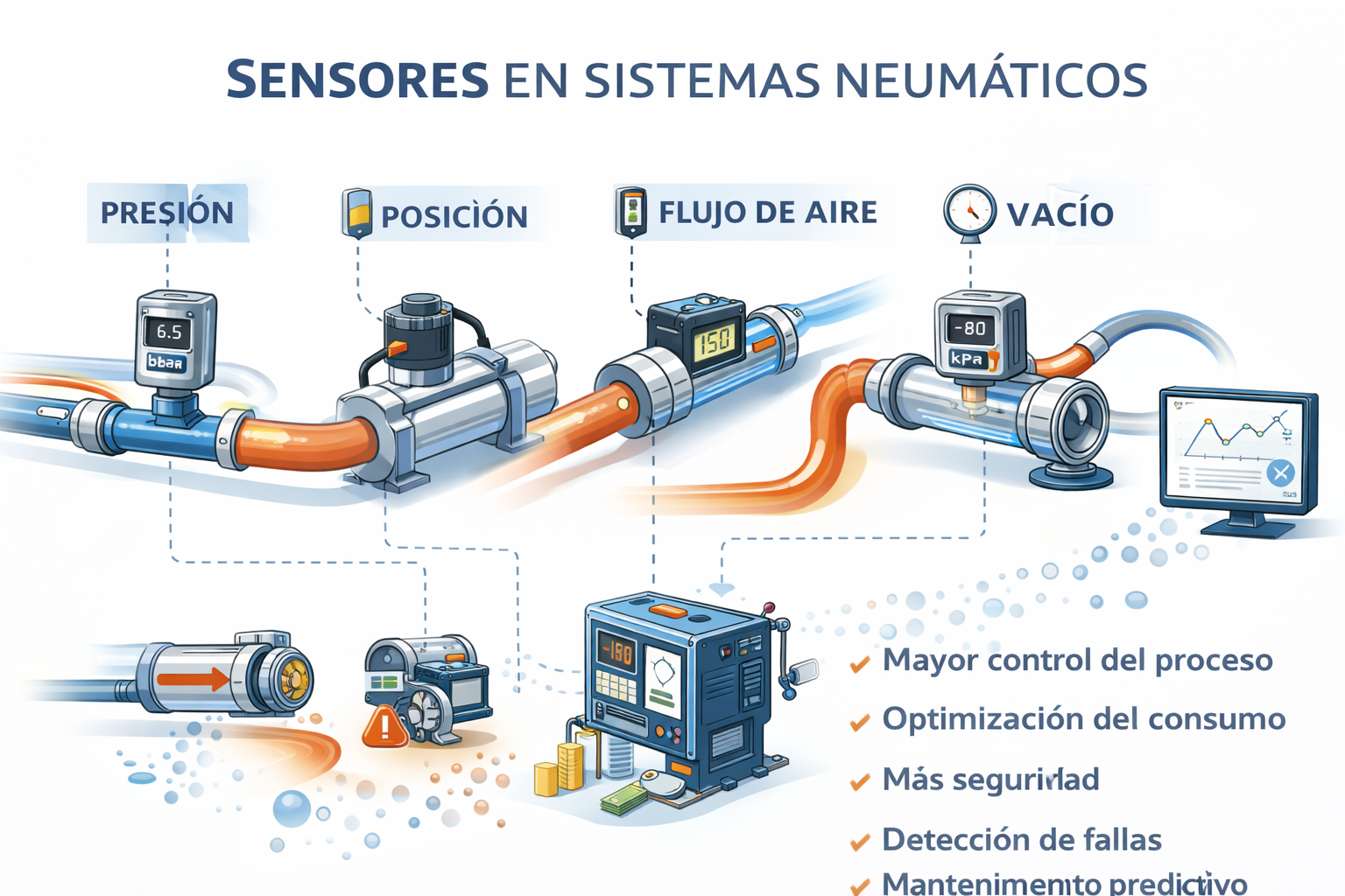 En los sistemas neumáticos modernos, los sensores juegan un papel fundamental para garantizar precisión, seguridad y eficiencia en los procesos industriales. Gracias a ellos es posible monitorear variables clave del sistema y optimizar el funcionamiento de actuadores, válvulas y equipos de control.